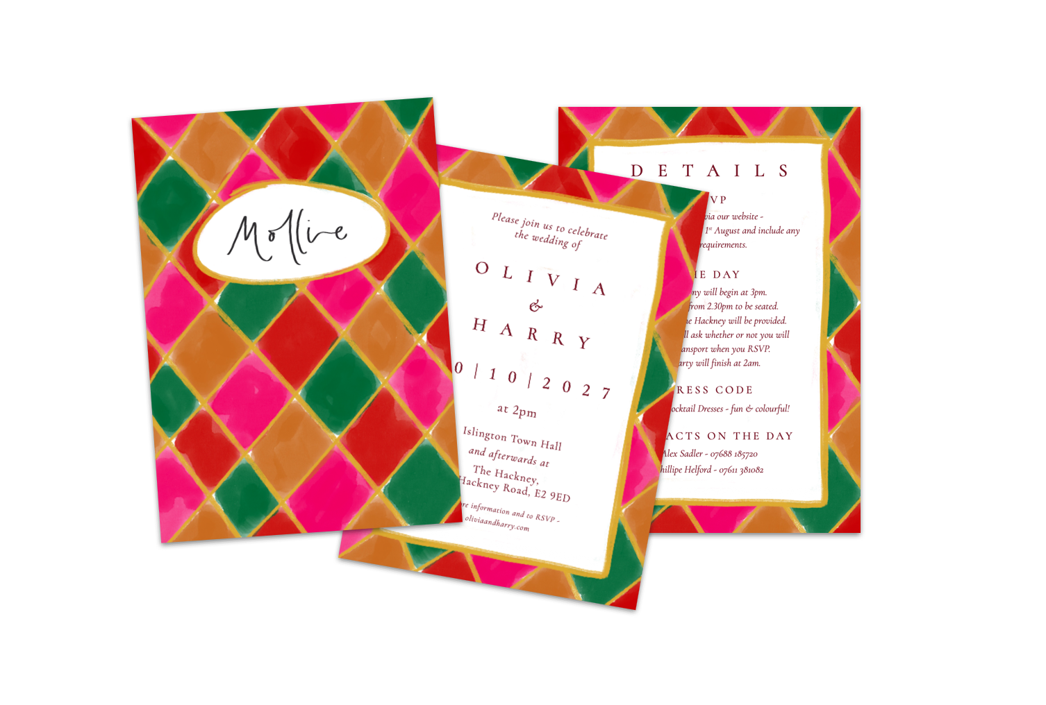 The ‘technicolour harlequin’ - this design is a bold celebration of colour. Featuring a full-page, hand-painted geometric pattern in vibrant jewel tones, this design brings a high-fashion, artistic edge to your stationery suite.