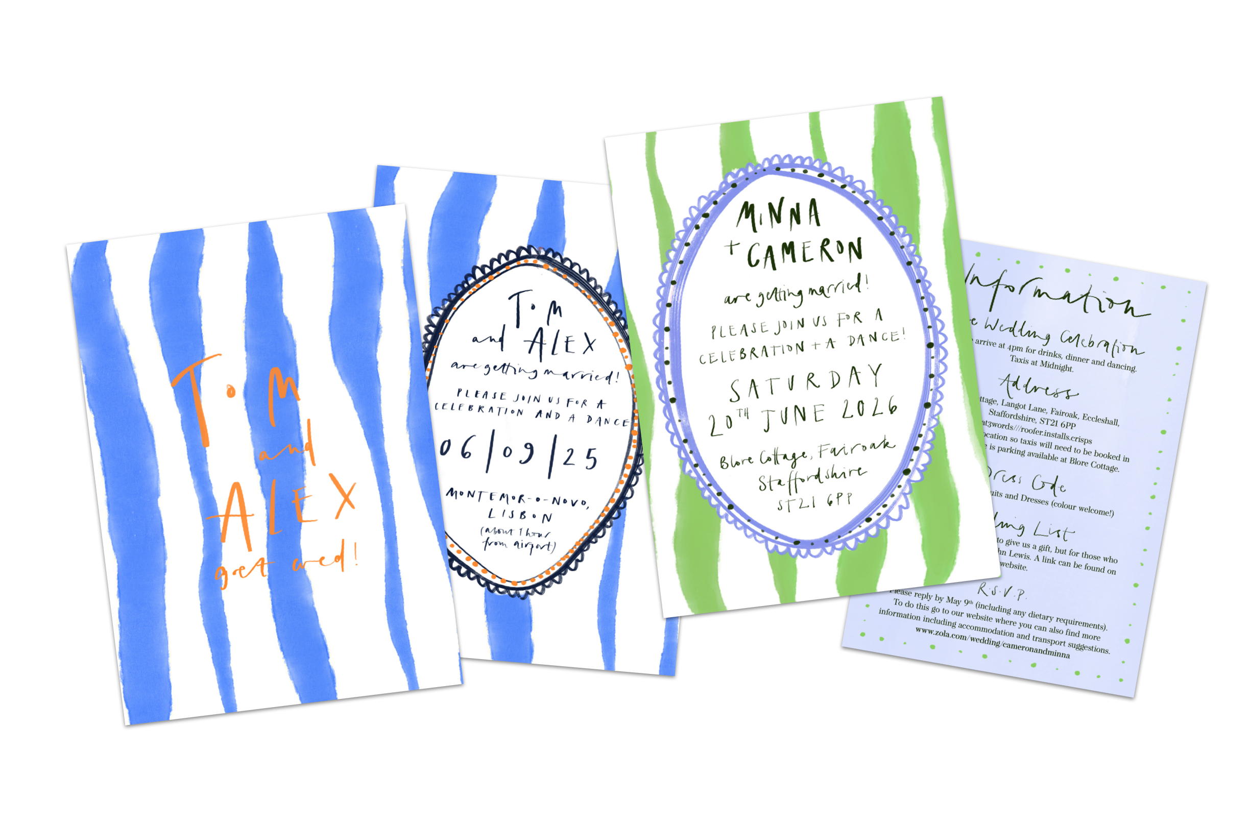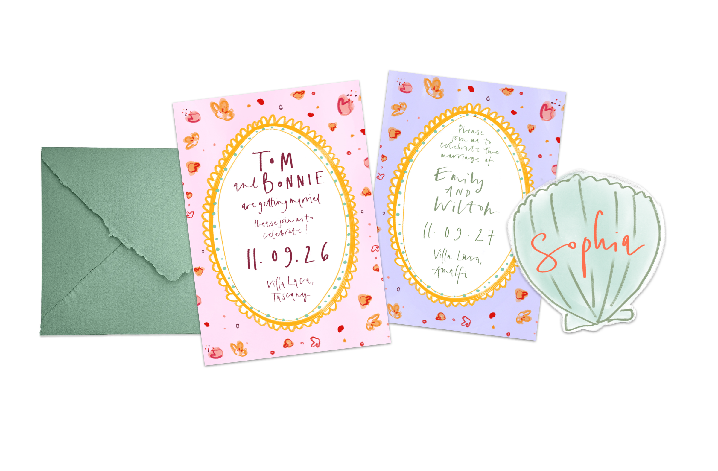 These designs capture the energy of warmer climes. Vibrant florals, lots of watercolour, gregarious stripes and joyful colour (of course). I hope that these designs feel fresh and informal - and that they might transport you to an English Summer garden party or destination wedding.