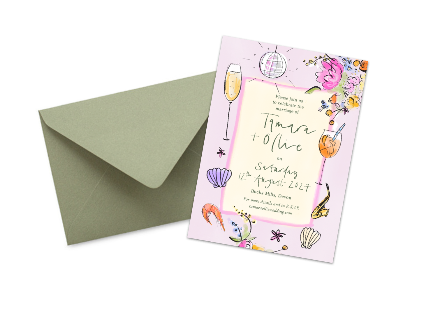 Illustrations: Specify hand-drawn elements; drinks, flowers, instruments, disco balls, pets etc.